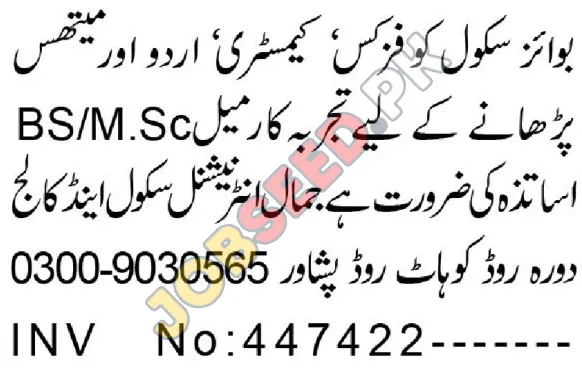 Jamal International School & College is seeking dedicated and experienced Lecturers to join their faculty. We have an immediate need for instructors in Physics, Chemistry, Urdu, and Mathematics. The ideal candidates will be passionate about education and committed to providing a stimulating learning environment for our students. Candidates must be experienced.