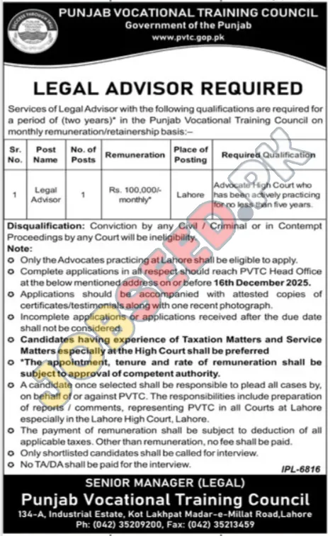 Punjab Vocational Training Council is now recruiting in Lahore. Apply for the position of Legal Advisor. The required qualification is LLB. This role is within the Management industry. A associate degree is preferred. The application process commenced on 03 December, 2025 via Jang Newspaper. Interested and eligible candidates must submit their applications before the deadline on 16 December, 2025. This is a prime opportunity to join a renowned organization. For a step-by-step application guide and full eligibility criteria, please see the official advertisement on https://www.jobseed.pk.