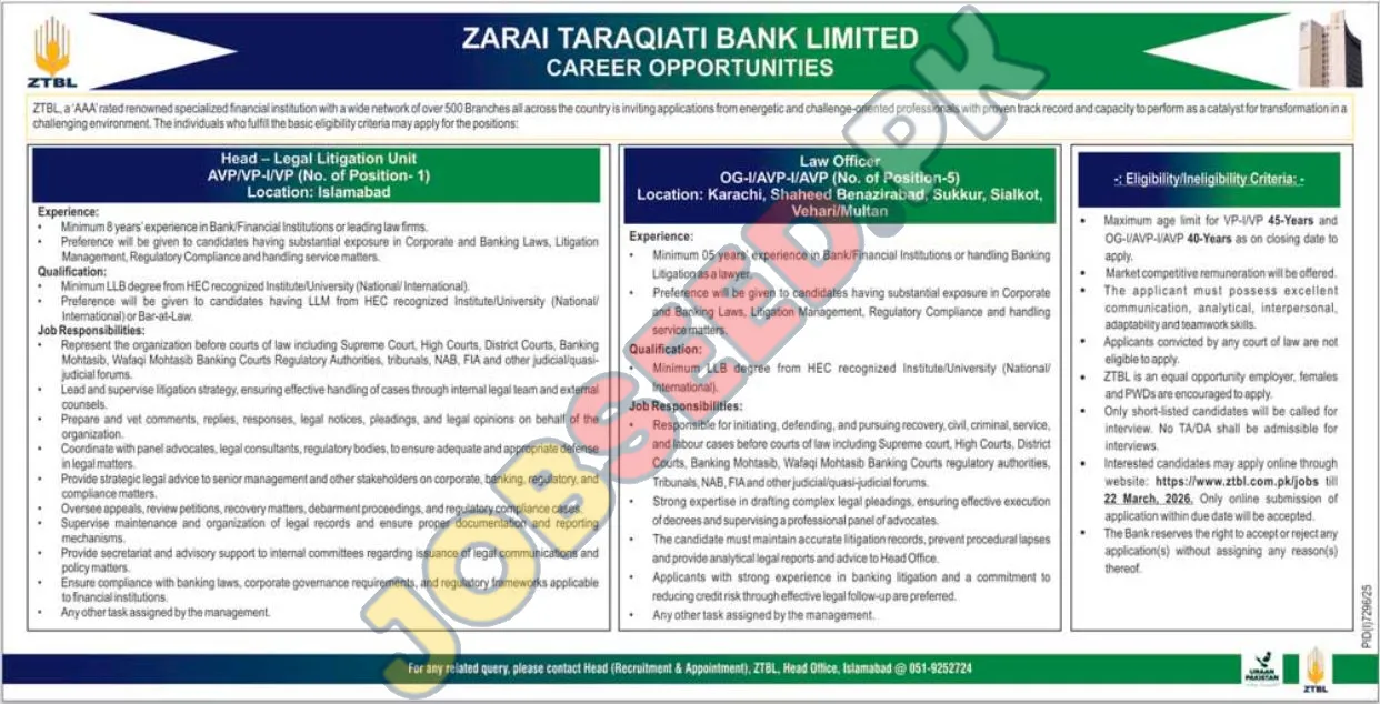 Zarai Taraqiati Bank Limited (ZTBL), a prominent financial institution with an extensive network, is actively seeking skilled legal professionals to join its dynamic team. This is an excellent opportunity for experienced lawyers to contribute to a leading private sector bank and advance their careers. We are looking for individuals with a strong understanding of banking laws and litigation to fill key positions. Explore these exciting job openings and become part of a growth-oriented organization offering competitive remuneration and professional development.