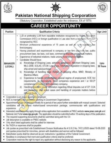 The Pakistan National Shipping Corporation (PNSC), a distinguished statutory corporation operating since 1979, is extending an invitation for skilled legal professionals to apply for the position of Legal Manager. This is a significant career opportunity within the government sector, offering a chance to contribute to a vital national entity. The role requires a robust legal background, particularly in maritime and corporate law, with a minimum of 15 years of hands-on experience.
