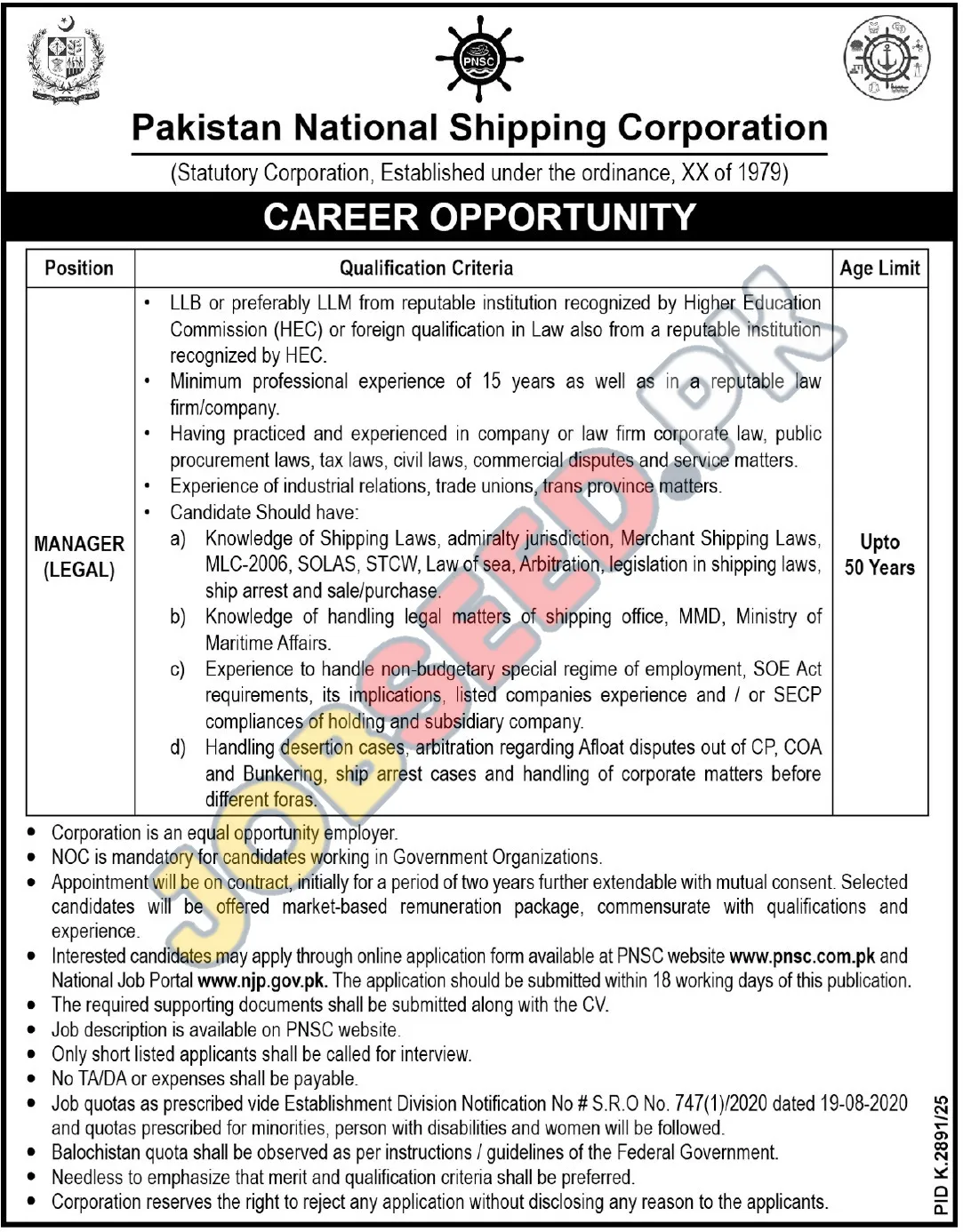 Pakistan National Shipping Corporation (PNSC), a leading government organization, is seeking a skilled Legal Manager to oversee legal matters related to shipping and maritime law. This is an excellent career opportunity for experienced legal professionals looking for government jobs in the shipping industry. The role involves managing legal affairs, interpreting laws, and providing legal guidance. This position offers a competitive salary and the potential for professional growth within a well-established organization. Apply now to be part of the latest hiring initiative at PNSC.