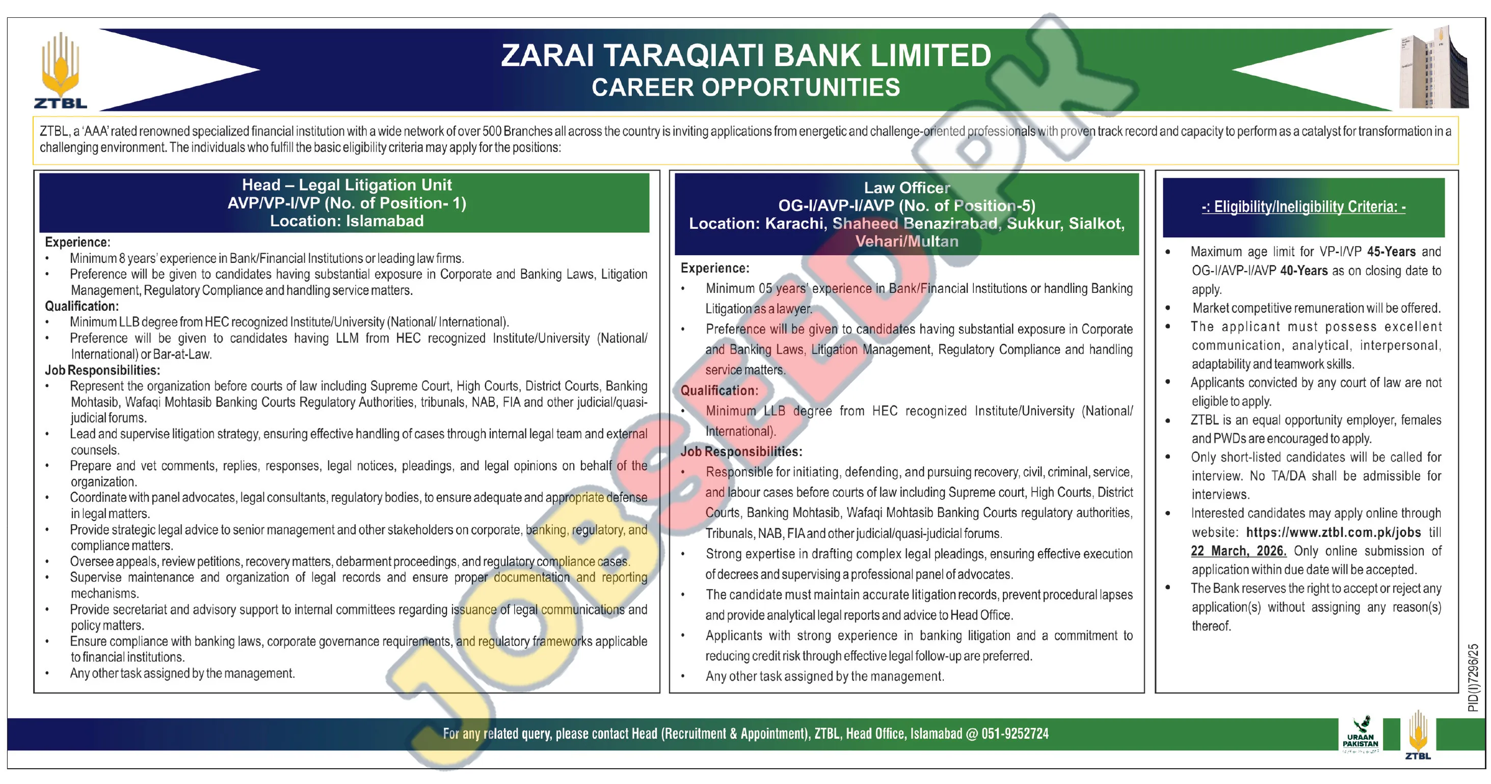 - Contact for Queries: For any related inquiries, please contact the Head (Recruitment & Appointment), ZTBL Head Office, Islamabad at 051-9252724.