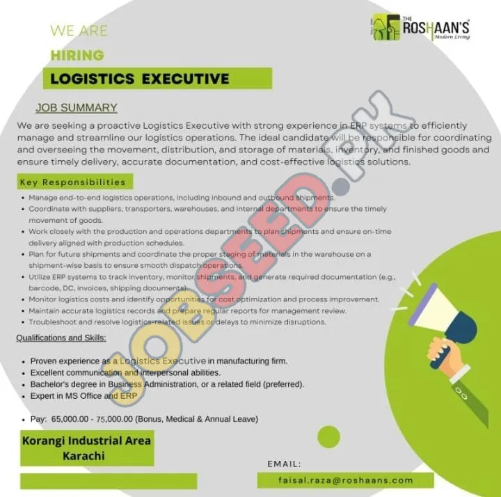 Roshaan's is now recruiting in Karachi. Apply for the position of Logistics Executive. The required qualification is BA. This role is within the Manufacturing industry. The application process commenced on 29 November, 2025 via Image Advertisement. Interested and eligible candidates must submit their applications before the deadline on 11 December, 2025. This is a prime opportunity to join a renowned organization. For a step-by-step application guide and full eligibility criteria, please see the official advertisement on https://www.jobseed.pk.