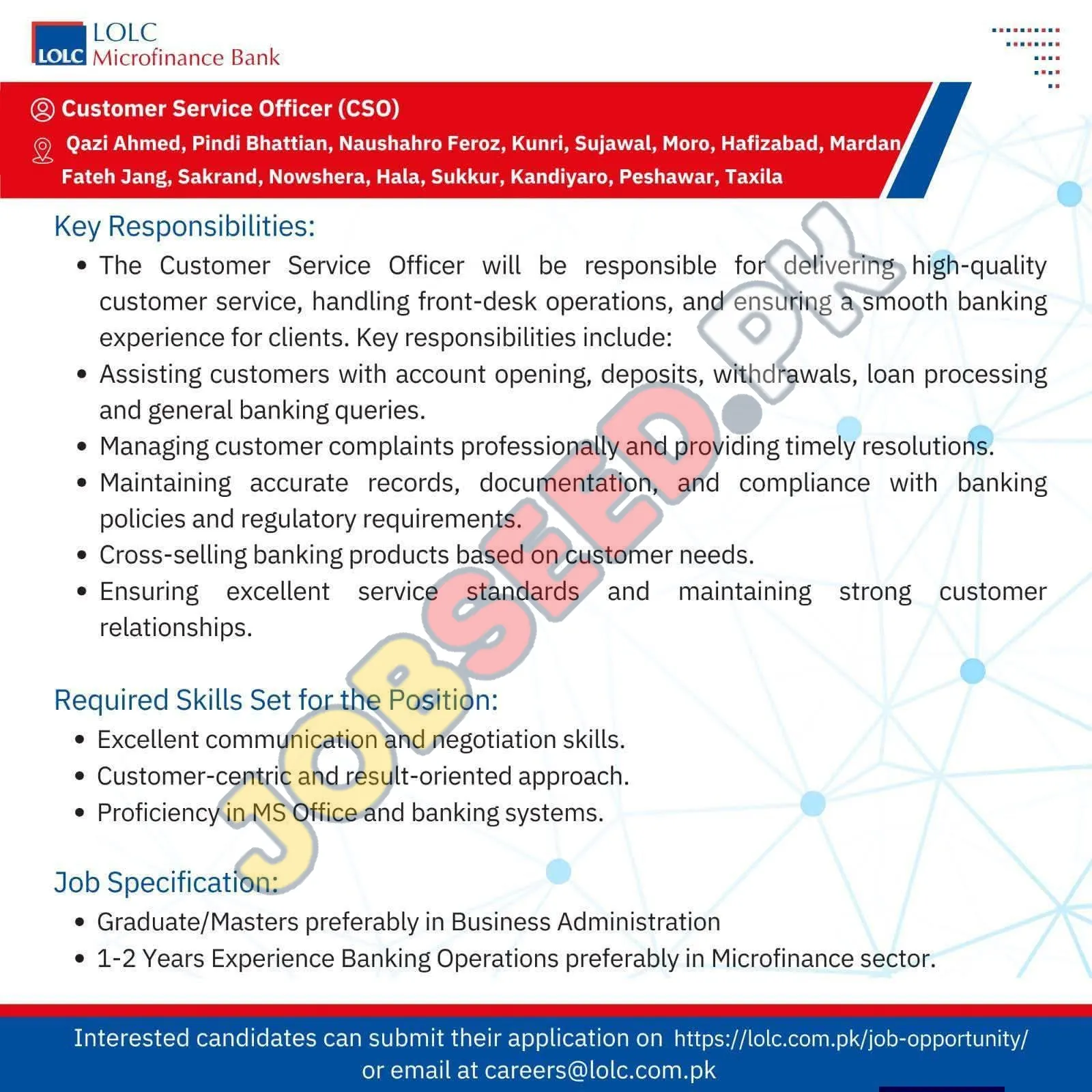 Apply at LOLC Microfinance Bank, latest jobs in Customer Service department before closing date which is around 07 January, 2026 or as per closing date in newspaper ad. Read complete ad online to know how to apply on latest LOLC Microfinance Bank job opportunities. For Further details visit https://www.jobseed.pk.