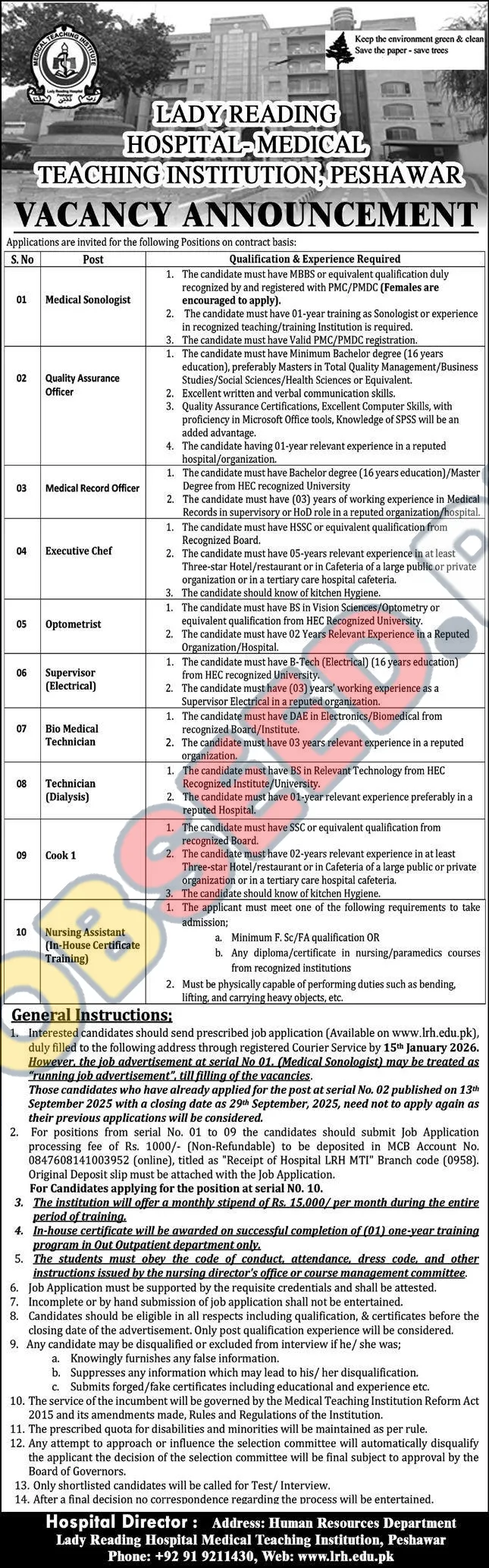 LRH, Peshawar invites applications from eligible candidates for the post of Medical Sonologist, Quality Assurance Officer, Medical Record Officer, Executive Chef, Optometrist, Supervisor (Electrical), Bio Medical Technician, Technician (Dialysis), Cook 1 and Nursing Assistant (In-House Certificate Training) as per advertisement of 01 January, 2026. MBBS, Master, Bachelor, Intermediate, BS, BE, DAE, Matric educational qualification will be preferred.