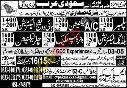 Join the team at M Pak Makkah Manpower Services in Dammam Saudi Arabia. They are seeking to hire 5 qualified individuals for the roles of Electrician, AC Technician, Building Electrician, Water Pump Mechanic and Charger Technician. This is a Full-Time position. This career opportunity was advertised on 13 December, 2025 in Express Newspaper. The last date to apply is 16 December, 2025. Don't miss this chance to advance your career with M Pak Makkah Manpower Services. For more information and to apply online, visit https://www.jobseed.pk.