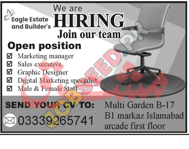 Real Estate Company is now recruiting in Islamabad. Apply for the position of Male & Female Staff. The required qualification is Matric. This role is within the Management industry. A bachelor degree is preferred. The application process commenced on 29 November, 2025 via Mashriq Newspaper. Interested and eligible candidates must submit their applications before the deadline on 14 December, 2025. This is a prime opportunity to join a renowned organization. For a step-by-step application guide and full eligibility criteria, please see the official advertisement on https://www.jobseed.pk.