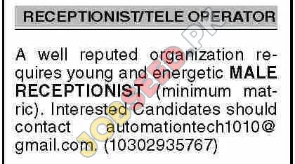 This advertisement is for a Male Receptionist in a well-reputed organization. Candidates must have a minimum qualification of Matric. Interested individuals are encouraged to apply immediately. High CPC