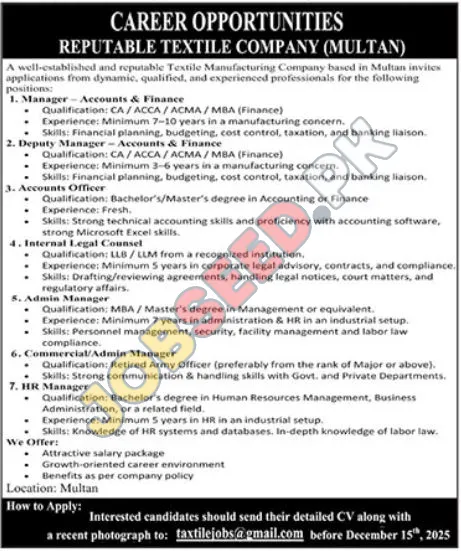 Textile Company is now recruiting in Multan. Apply for the position of Manager Accounts & Finance. The required qualification is BA. This role is within the Management industry. A bachelor degree is preferred. The application process commenced on 28 November, 2025 via Jang Newspaper. Interested and eligible candidates must submit their applications before the deadline on 15 December, 2025. This is a prime opportunity to join a renowned organization. For a step-by-step application guide and full eligibility criteria, please see the official advertisement on https://www.jobseed.pk.