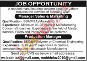A well-reputed manufacturing concern based in Lahore is currently seeking experienced and dedicated professionals to join their team. This is an excellent opportunity to advance your career within a thriving industrial environment. The organization values expertise and provides a platform for professional growth.