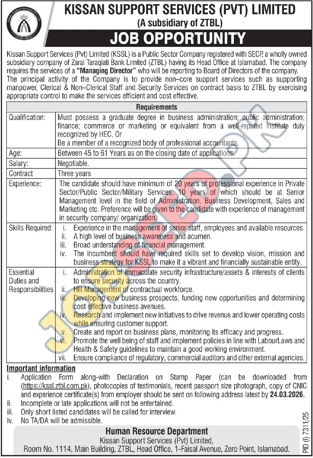 Kissan Support Services (Pvt) Limited (KSSL), a distinguished Public Sector Company and a subsidiary of Zarai Taraqiati Bank Limited (ZTBL), is extending an invitation for a seasoned professional to assume the role of Managing Director. This executive position is integral to the company's mission of providing efficient and cost-effective non-core support services, including manpower, clerical, non-clerical, and security functions. The Managing Director will report directly to the Board of Directors and will be responsible for strategic leadership and operational oversight. Key Highlights:- Role: Managing Director