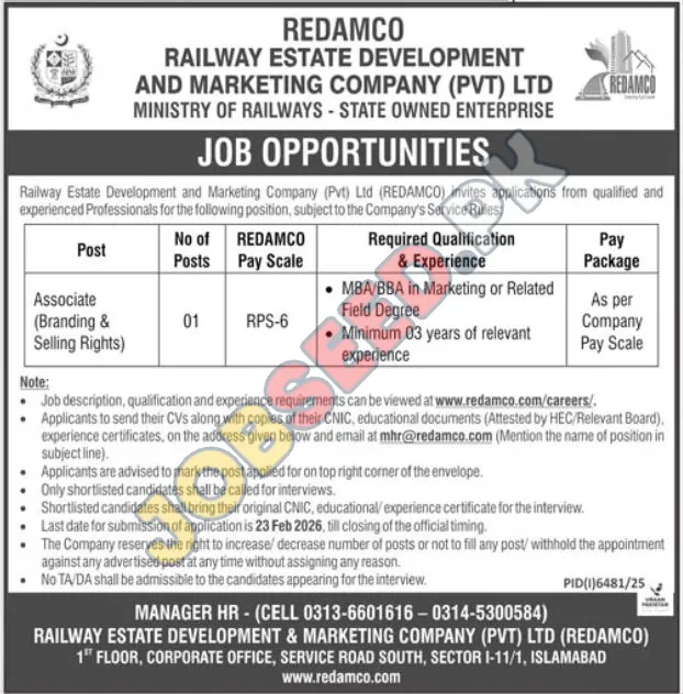 Railway Estate Development and Marketing Company (REDAMCO), a state-owned enterprise under the Ministry of Railways, is seeking a qualified professional for the position of Marketing Associate. This exciting career opportunity in Islamabad requires a minimum of three years of relevant experience in branding and sales. The ideal candidate will hold an MBA or BBA in Marketing or a related field. This role offers a competitive salary package and a chance for professional growth within a public sector organization. Interested applicants are encouraged to review the detailed requirements and apply before the deadline for this government job opening. This position represents excellent Marketing Associate jobs in Islamabad in the region.