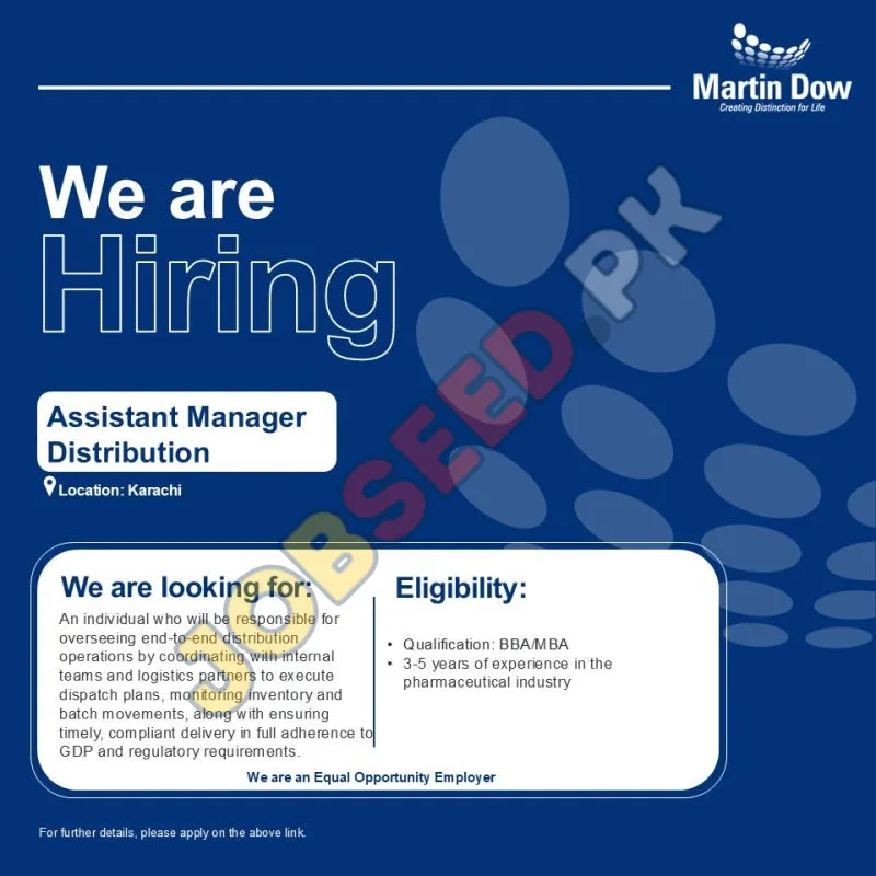 Martin Dow is actively hiring an Assistant Manager Distribution. This is a great opportunity to become part of a leading pharmaceutical company, offering excellent career opportunities.
