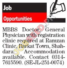 Ramzan Clinic in Barkat Town, Shahdara, is seeking a dedicated and qualified MBBS Doctor to serve as a General Physician. This is an excellent opportunity for a medical professional to contribute to a well-established clinic and provide essential healthcare services to the community. Accommodation is available.