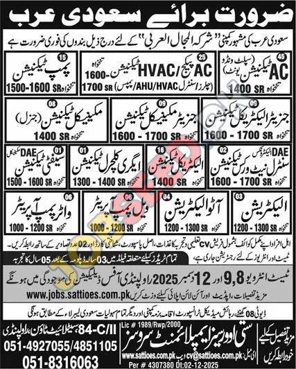 Career opportunity at Satti Overseas Employment Services located in Jeddah Saudi Arabia Pakistan for the position of Mechanical Technician. This employment notice was announced on 05 December, 2025. Candidates possessing a Diploma degree are encouraged to submit their application.
