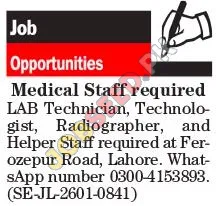 Medical Staff Hiring in Lahore: Technician, Technologist, Radiographer & Helper Opportunities