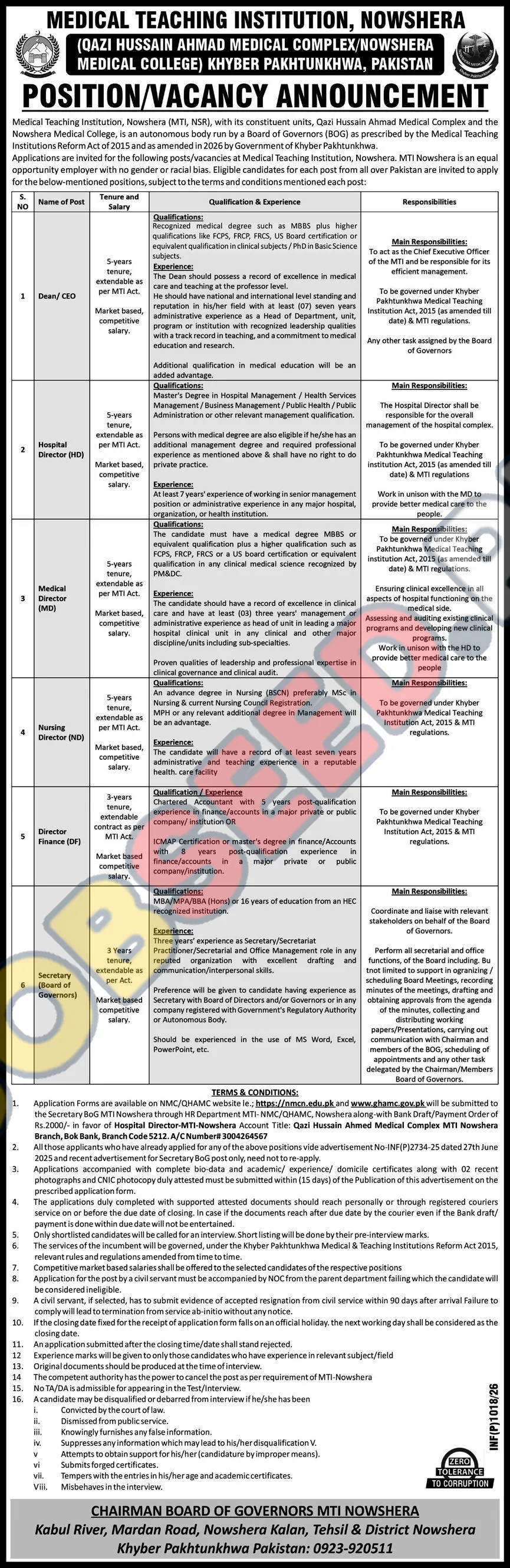 - Departmental Submission: Applications should be forwarded through the HR Department, MTI-Nowshera, to the office of the Hospital Director, MTI Nowshera.
