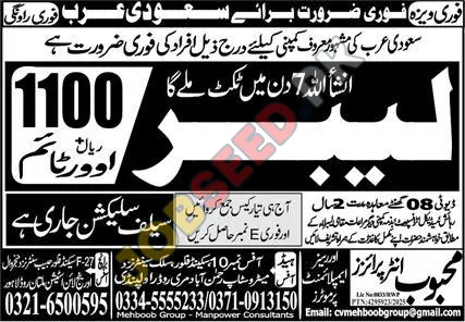 Apply at Mehboob Enterprises Overseas Employment Promoters, latest jobs in Labor department before closing date which is around 23 December, 2025 or as per closing date in newspaper ad. Read complete ad online to know how to apply on latest Mehboob Enterprises Overseas Employment Promoters job opportunities. For Further details visit https://www.jobseed.pk.