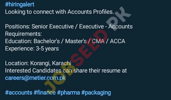 Join the team at Metier in Karachi, Sindh. They are seeking to hire 2 qualified individuals for the roles of Senior Executive - Accounts and Executive - Accounts. This is a full-time position. This career opportunity was advertised on 29 November, 2025 in Online Job Board. The last date to apply is 11 December, 2025. Don't miss this chance to advance your career with Metier. For more information and to apply online, visit https://www.jobseed.pk.