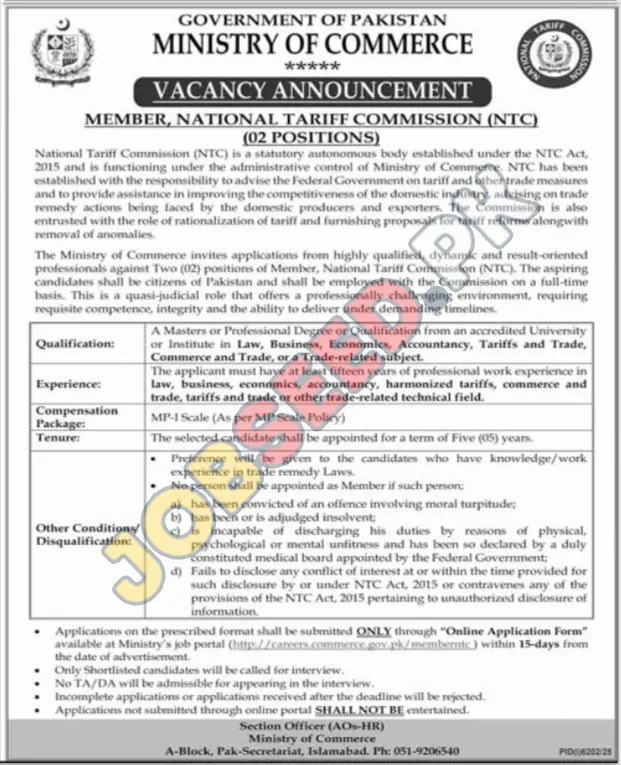 The Ministry of Commerce, Government of Pakistan, invites applications from highly qualified and dynamic professionals for the position of Member, National Tariff Commission (NTC). This is a prestigious public sector employment opportunity for individuals seeking to contribute to national economic policy in Islamabad. The National Tariff Commission is a statutory autonomous body responsible for advising the Federal Government on trade measures and tariff policies to enhance the competitiveness of local industries.