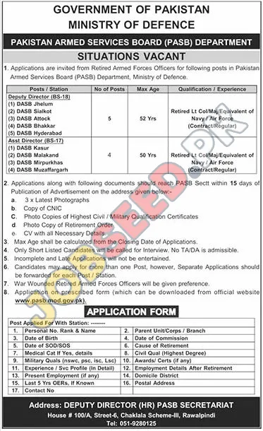 The Pakistan Armed Services Board (PASB), Ministry of Defence, is seeking applications from dedicated and experienced Retired Armed Forces Officers to fill positions within the organization. This is an excellent opportunity to continue serving the nation in a civilian capacity. Key positions include Deputy Director (BS-18) and Assistant Director (BS-17) roles across various stations.