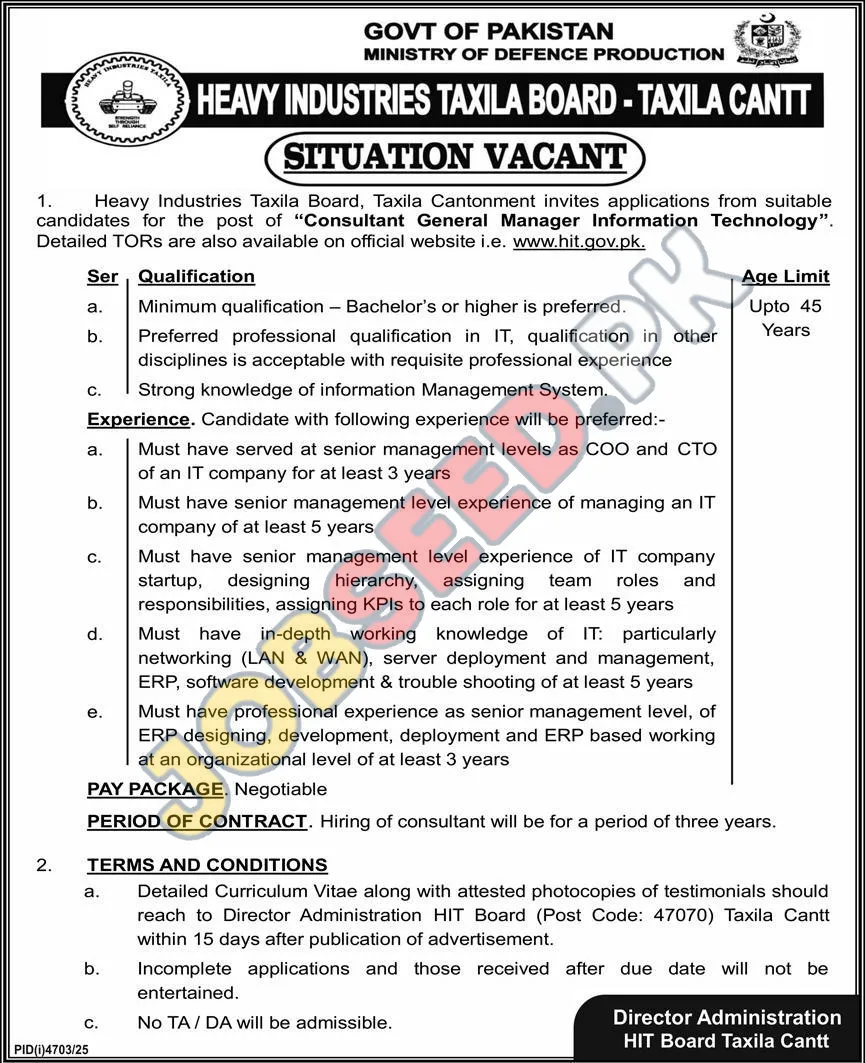 Ministry of Defence Production, Taxila Punjab Pakistan invites applications from eligible candidates for the post of Consultant General Manager Information Technology as per advertisement of 07 December, 2025, published in Express Newspaper. Bachelor educational qualification will be preferred.