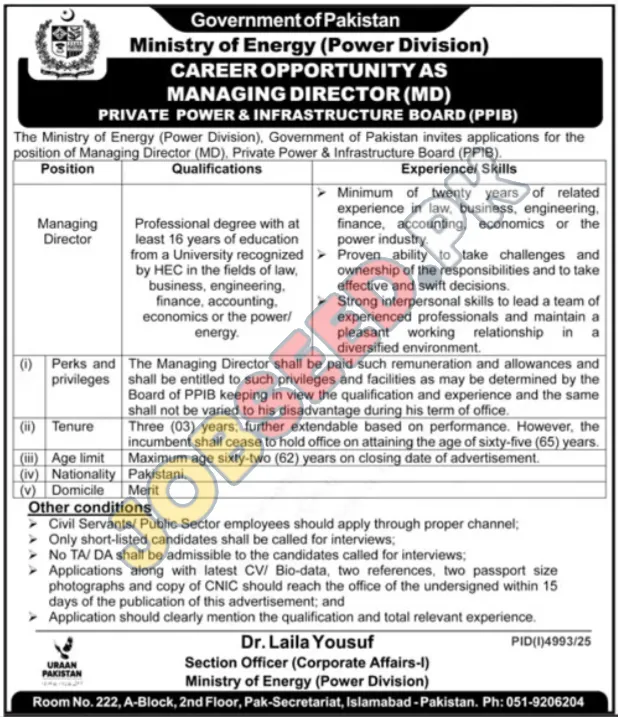 The Ministry of Energy (Power Division), Government of Pakistan, is seeking a highly qualified and experienced professional for the position of Managing Director (MD) for the Private Power & Infrastructure Board (PPIB). This is a critical leadership role responsible for overseeing private sector investment and infrastructure development within the power sector.