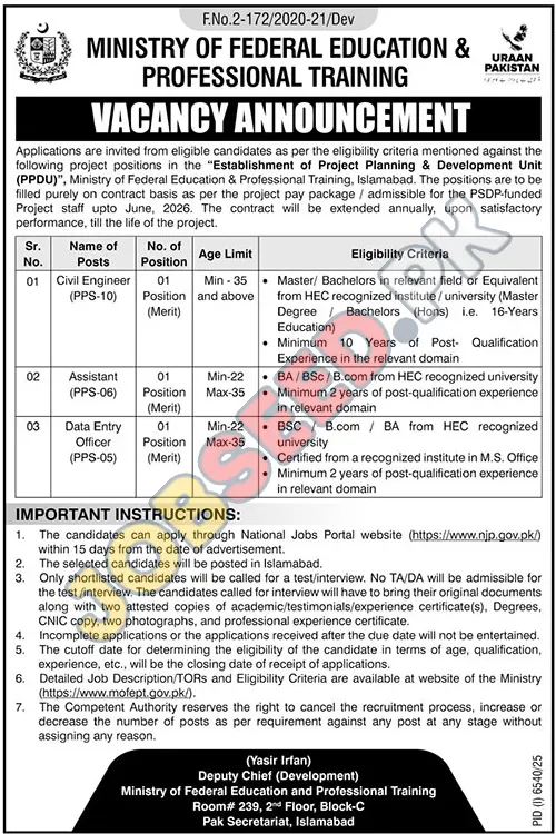 The Ministry of Federal Education and Professional Training in Pakistan is currently seeking qualified professionals for several key positions within the "Establishment of Project Planning & Development Unit (PPDU)" in Islamabad. These government jobs offer excellent career opportunities for individuals looking to contribute to public sector development projects. The available positions include Civil Engineer, Assistant, and Data Entry Officer. The roles are offered on a contract basis, initially valid until June 2026, with potential for annual extension based on performance. Candidates with relevant experience and qualifications are encouraged to apply for these competitive positions in the federal government sector.
