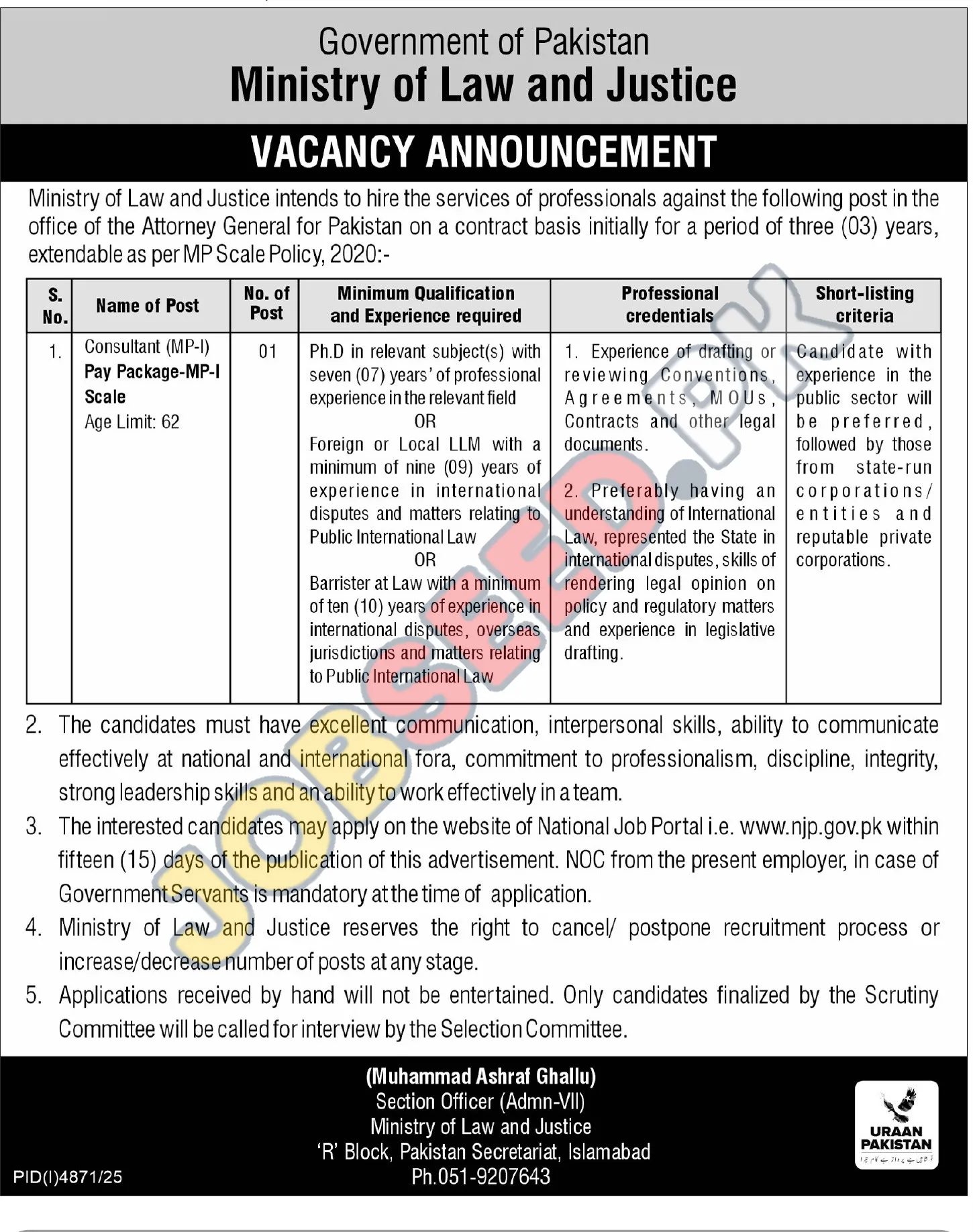 The Ministry of Law and Justice is seeking a qualified professional to serve as a Consultant (MP-I) at the office of the Attorney General for Pakistan. This is a contract-based position with the possibility of extension as per MP Scale Policy, 2020. This role provides a unique opportunity to contribute to legal matters on a national level.