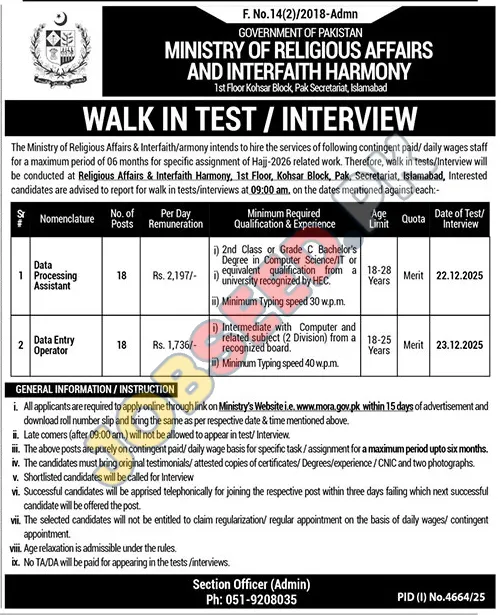 Ministry of Religious Affairs & Interfaith Harmony, Islamabad Islamabad Pakistan invites applications from eligible candidates for the post of Data Processing Assistant and Data Entry Operator as per advertisement of 06 December, 2025. Bachelor, Intermediate educational qualification will be preferred.
