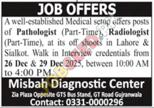 Misbah Diagnostic Center, Gujranwala invites applications from eligible candidates for the post of Pathologist and Radiologist as per advertisement of 25 December, 2025. BSC educational qualification will be preferred.