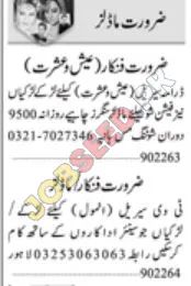 - Daily wages of 9500 PKR are offered for fashion shows and drama serials.
