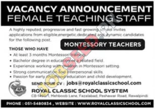 Royal Classic School System, a distinguished private sector institution, is currently hiring passionate female teachers for Montessori positions. These roles provide a chance for dedicated educators to thrive in a dynamic academic environment. If you are passionate about early childhood education and hold the required qualifications, this is the perfect chance for professional growth.