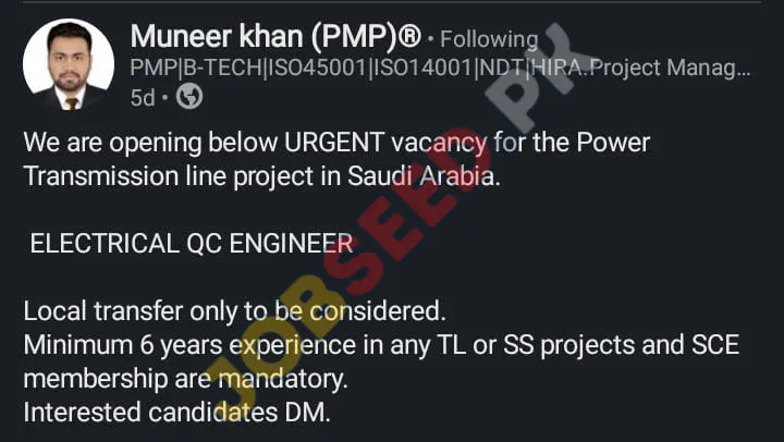 Muneer khan (PMP), Riyadh invites applications from eligible candidates for the post of Electrical QC Engineer as per advertisement of 04 December, 2025, published in Social Media. BE educational qualification will be preferred.