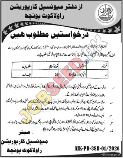 Municipal Corporation Rawalakot Poonch, Rawalakot Poonch invites applications from eligible candidates for the post of Inspector Encroachment P-5 as per advertisement of 15 January, 2026. Intermediate educational qualification will be preferred.