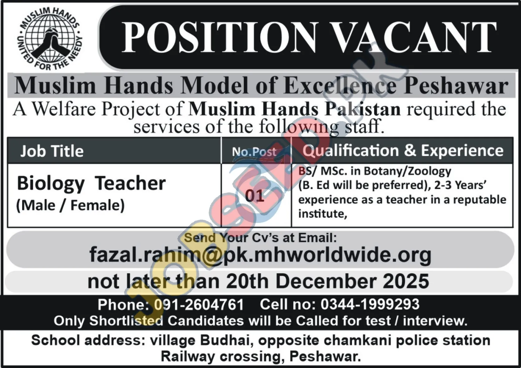 Muslim Hands, Peshawar Khyber Pakhtunkhwa KPK Pakistan invites applications from eligible candidates for the post of Biology Teacher as per advertisement of 13 December, 2025, published in Aaj Newspaper. Master educational qualification will be preferred.