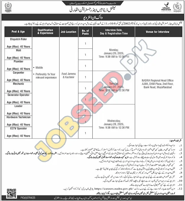 NADRA, Muzaffarabad invites applications from eligible candidates for the post of Dispatch Rider, Mali, Plumber, Carpenter, Mechanic, Generator Operator, Loader, Hardware Technician and CCTV Operator as per advertisement of 13 January, 2026. Middle educational qualification will be preferred.