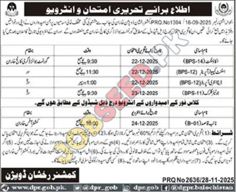 The Commissioner Rakhshan Division is pleased to announce written exams and interviews for various vacant positions. Candidates who have already submitted their applications to the office are hereby informed that the written exams will be conducted according to the schedule provided below at Government Boys Degree College, Kharan. The announcement regarding the interview dates will be made later.