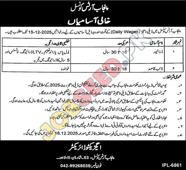 The Punjab Arts Council is seeking qualified candidates for the following positions on a daily wage basis. These roles offer opportunities to contribute to the vibrant cultural landscape of Punjab. Successful candidates will join a dynamic team and play a key role in supporting the council's mission. Please note the application deadline is December 15, 2025.