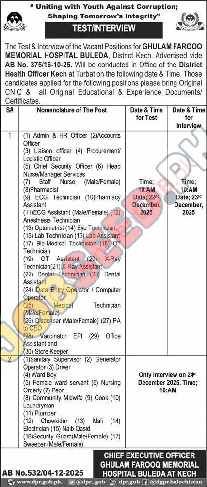 Ghulam Farooq Memorial Hospital Buleda is seeking qualified and dedicated individuals to fill various positions. The hospital's recruitment drive aims to enhance its medical and administrative services.