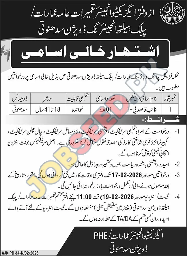 A new government job opening for the position of Naib Qasid has been announced by the Public Health Engineering Division Sudhanoti. This vacancy is specifically for residents of Sudhanoti, Azad Jammu & Kashmir. Additionally, government jobs are available for qualified candidates. The role requires basic literacy skills and offers a stable career path within the public sector. Additionally, job vacancies 2026 are available for qualified candidates. Interested candidates should review the application requirements and submit their documents before the deadline to be considered for this government employment opportunity.