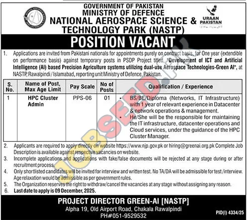 National Aerospace Science and Technology Park NASTP, Rawalpindi Punjab Pakistan invites applications from eligible candidates for the post of HPC Cluster Admin as per advertisement of 25 November, 2025. Diploma educational qualification will be preferred.