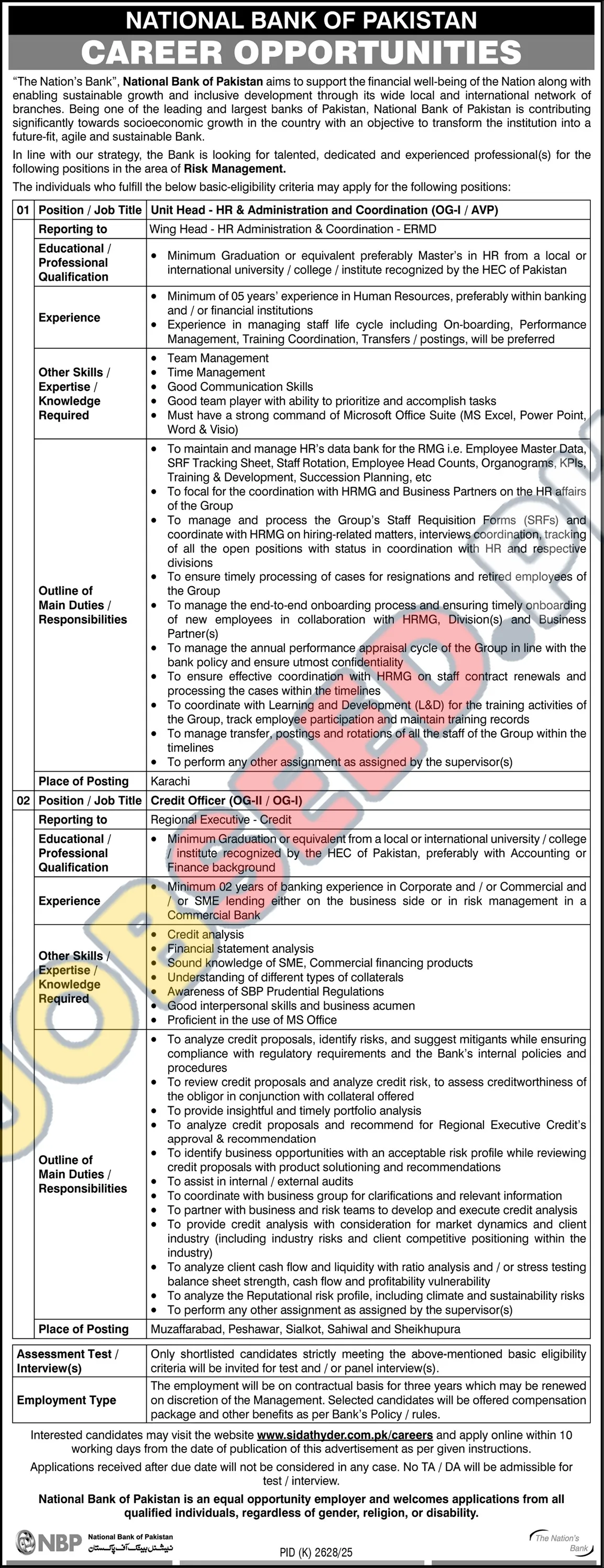 National Bank of Pakistan Career Opportunities: Unit Head HR and Credit Officer Jobs