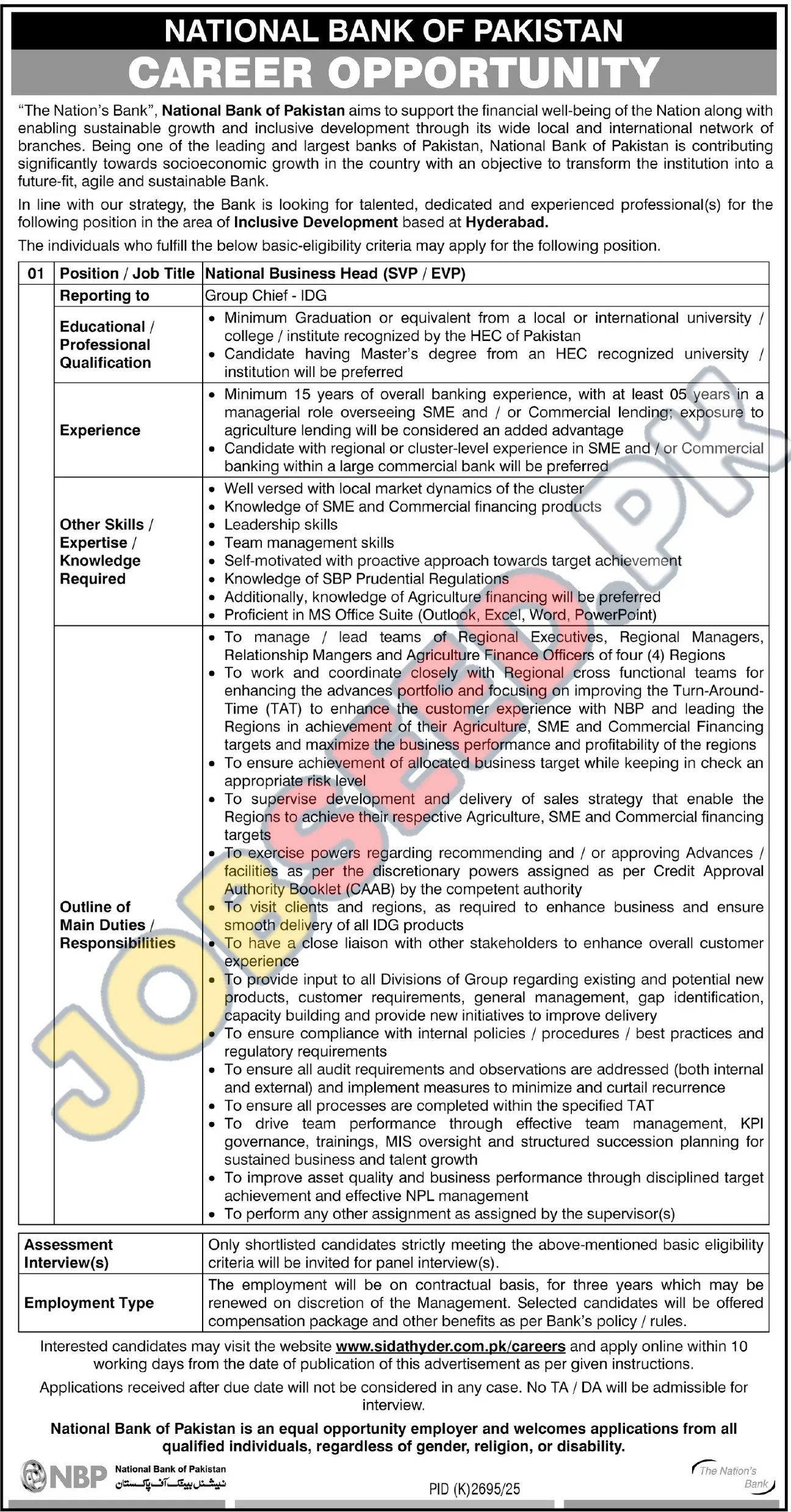 The National Bank of Pakistan, a cornerstone of the nation's financial well-being and a key contributor to socioeconomic growth, is extending an invitation for exceptional talent to join its ranks. As one of Pakistan's largest and most respected banks, NBP is dedicated to fostering sustainable growth and inclusive development across its extensive network. We are currently seeking a highly accomplished and results-oriented individual to fill the pivotal role of Business Head (SVP / EVP) within our Inclusive Development division, based in Hyderabad.