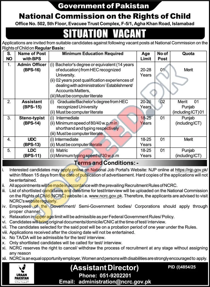 National Commission on the Rights of Child, Islamabad Islamabad Pakistan invites applications from eligible candidates for the post of Admin Officer, Assistant, Steno-typist, UDC and LDC as per advertisement of 13 December, 2025, published in Express Newspaper. Bachelor, Intermediate, Matric educational qualification will be preferred.