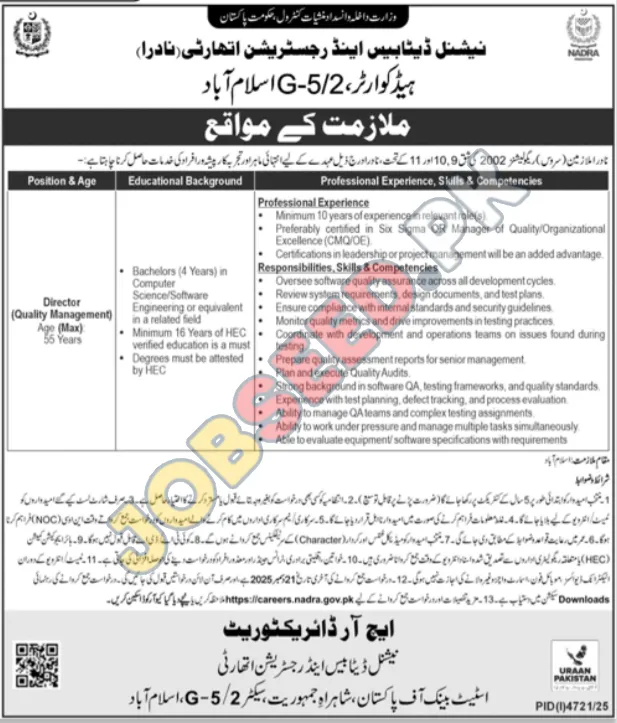 National Database & Registration Authority NADRA, Islamabad Islamabad Pakistan invites applications from eligible candidates for the post of Director (Quality Management) as per advertisement of 07 December, 2025, published in Jang Newspaper. Bachelor educational qualification will be preferred.