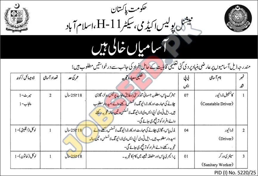 The National Police Academy, Islamabad, is seeking qualified candidates for various positions. These government jobs offer a chance to join a prestigious institution with competitive salary and opportunities for professional growth. We are looking for individuals for constable driver, driver and sanitary worker positions. Don't miss this excellent employment opportunity! Apply promptly.
