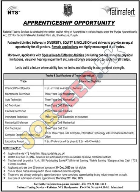 Fatimafert Limited, in collaboration with the National Testing Service (NTS), is excited to announce a range of apprenticeship opportunities under the Punjab Apprenticeship Act, 2021. These positions are based at the Fatimafert Limited Plant site in Sheikhupura, Punjab, and represent a fantastic chance for individuals looking to build a robust career in various technical fields.