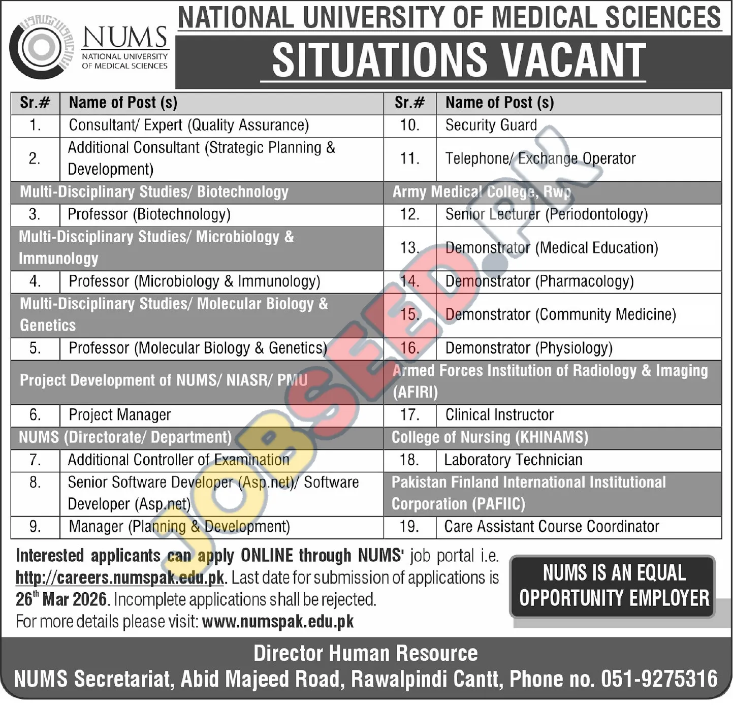 - Apply Online: Interested candidates must submit their applications exclusively through the official NUMS online job portal at http://careers.numspak.edu.pk.