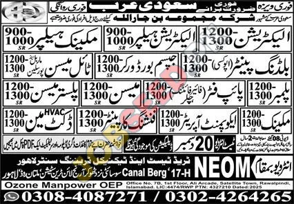 NEOM Trade Test & Technical Training Center, Jeddah Saudi Arabia Pakistan invites applications from eligible candidates for the post of Electrician, Electrician Helper, Mechanic Helper, Building Painter (Epoxy), Bodyboard Worker, Tile Mason, Tile Mason Porcelain, Plumber (Fire Fighting), Mason, HVAC Mechanic, Equipment Operator, Finishing Car Painter and Duct Man as per advertisement of 18 December, 2025, published in Express Newspaper. Matric, Primary, Diploma educational qualification will be preferred.